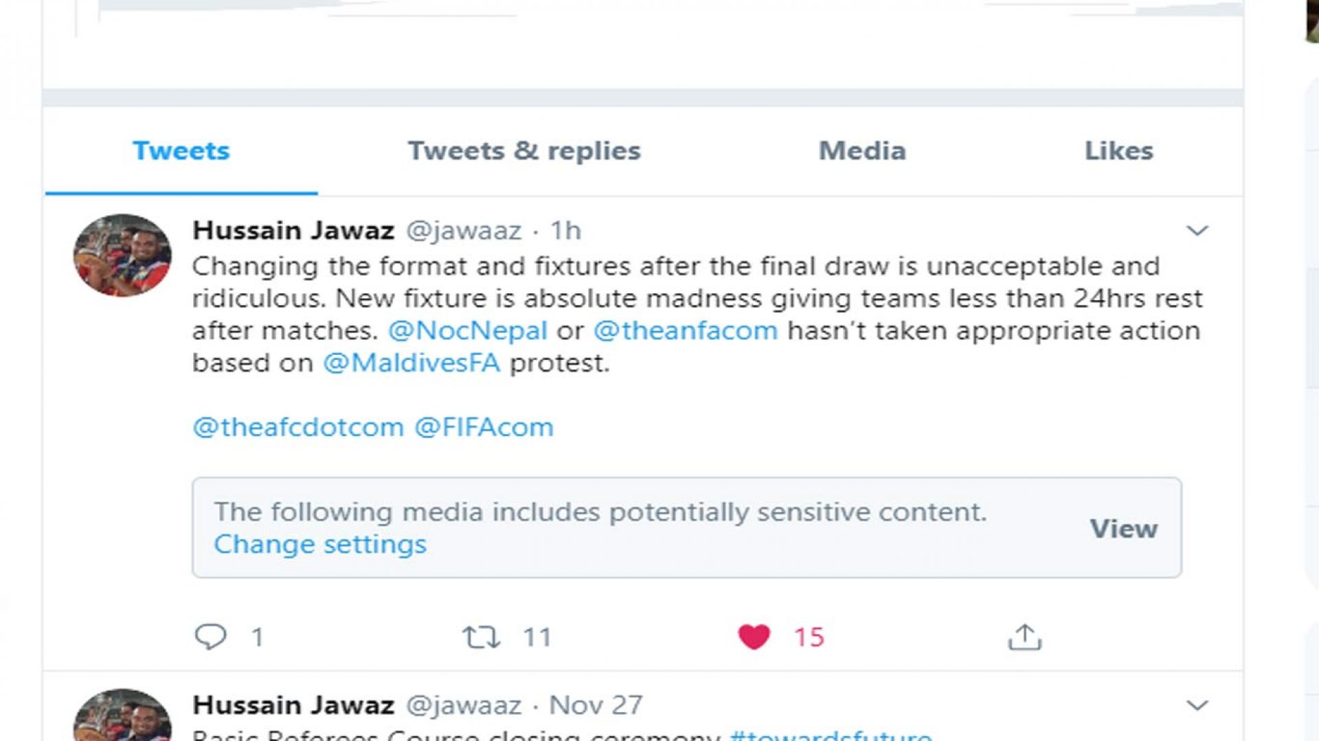 Jawaz tweeted earlier today calling the final draw 'unacceptable and ridiculous'. Maldives had complained after South Asian Federation changed the format from two group format to five team league format after India withdrew from the tournament.