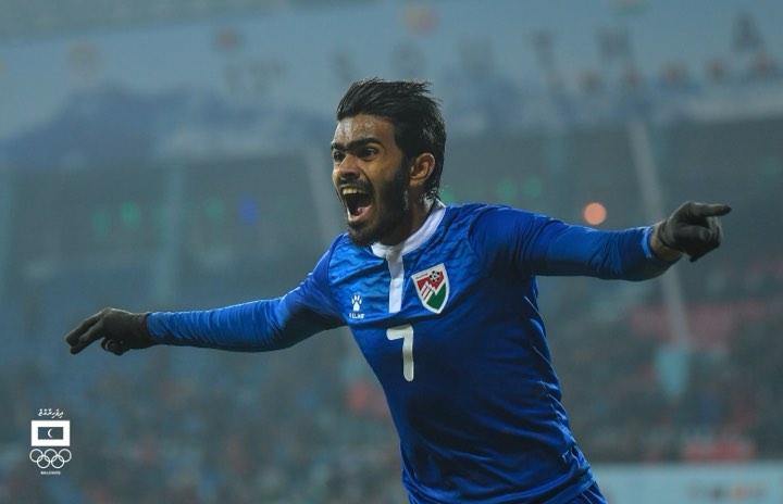| ފޭދޫ އިއްބެ ގޯލު ޖެހުމަށް ފަހު އުފާފާޅުކުރަނީ. – ފޮޓޯ: މޯލްޑިވްސް އޮލިމްޕިކް ކޮމިޓީ / ހުސައިން ވަހީދު |