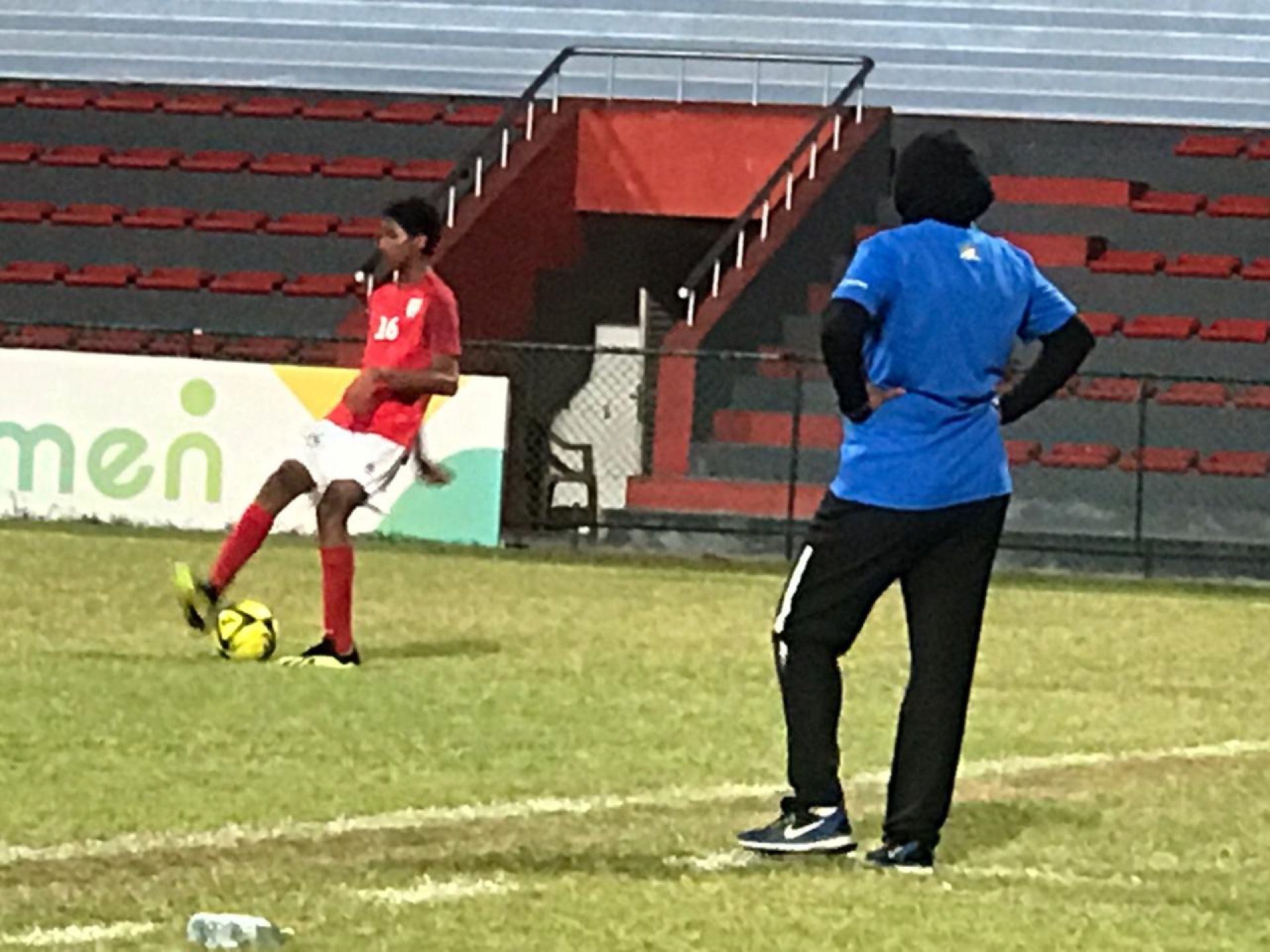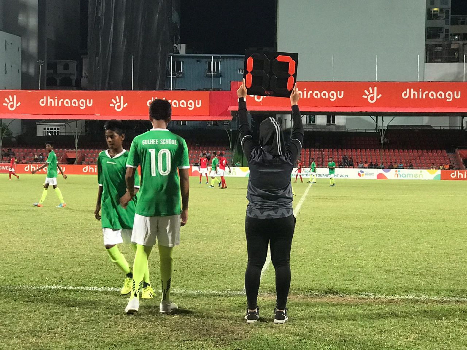 އިއްޔެ ރޭގަނޑު ކަލާފާނު ސްކޫލްއާއި ކ.ގުޅީ ސްކޫލްއާއި ބަށްދަލުކުރި މެޗުގައި މެޗުގެ އޮފިޝަލެއް ގޮތުގައި ވަނީ އަންހެން ބޭކަނބަލަކު ފެނިގެންގޮސްފައެވެ. އެގޮތުން އެފް.އޭ.އެމް އާއި އެ ސޯސިއޭސަންގެ ރެފްރީސް ޑިޕާރޓްމަންޓް ގުޅިގެން މިހާރު ކުރިއަށްގެންދާ ބޭސިކް ރެފެރީސް ކޯހުގައި ބައިވެރިންގެ ތެރެއިން އަންހެން ބައިވެރިއަކު ވަނީ މިމެޗުގެ ބަދަލު ރެފެރީއެެއްގެ ގޮތުގައި ހަރަކާތްތެރިވެފައެވެ.